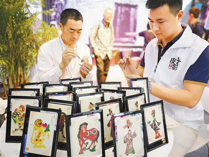 文博会大鹏新区展区,手工艺者现场雕刻皮影。